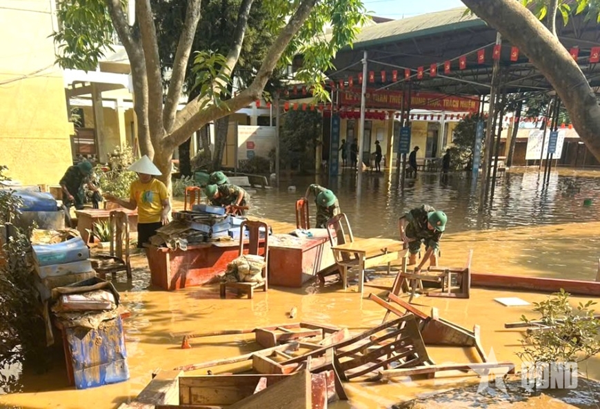 Bộ đội Trung đoàn 832 khắc phục hậu quả lũ lụt tại Trường Tiểu học Liên Minh, xã Tràng Xá, tỉnh Thái Nguyên.