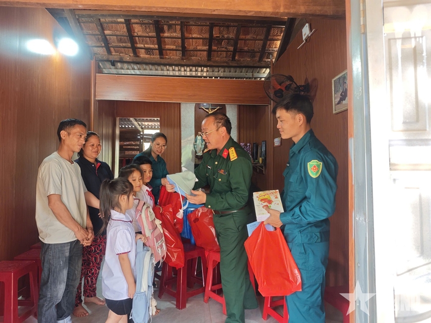 | Ban CHQS xã Đắk Sắk tặng sách vở, đồ dùng học tập cho 3 người con của vợ chồng anh Việt. |