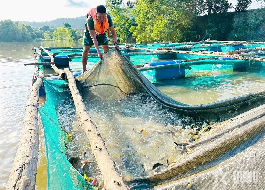 | Chiến sĩ Trung đoàn Minh Đạm thu hoạch cá từ mô hình nuôi cá lồng bè. |