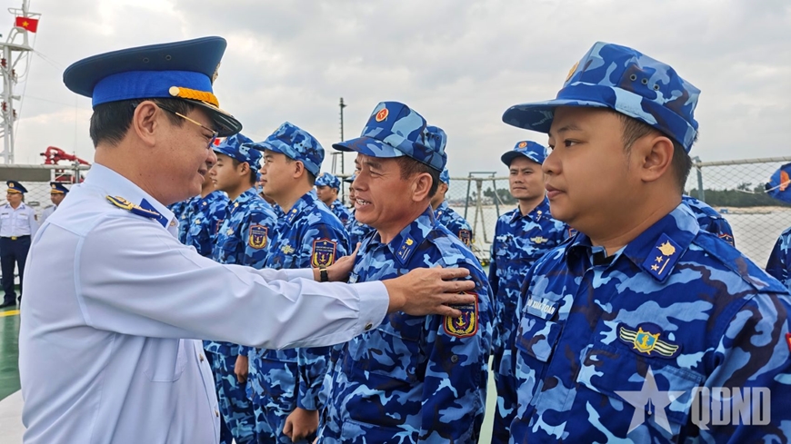 Trước giờ tàu rời bến, Đại tá Lê Huy, Chính ủy Vùng Cảnh sát biển 2 cùng đại diện lãnh đạo, chỉ huy các cơ quan, đơn vị đã giao nhiệm vụ, thăm hỏi, động viên cán bộ, chiến sĩ Tàu CSB 8002.