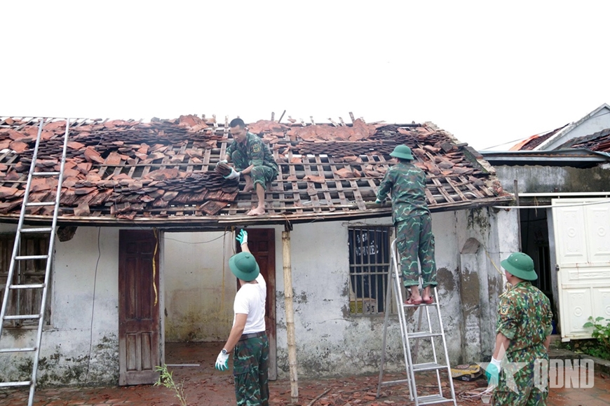 Bộ đội sửa lại nhà cho bà Nguyễn Thị Mãi tại xã Hoằng Giang do lốc xoáy. |