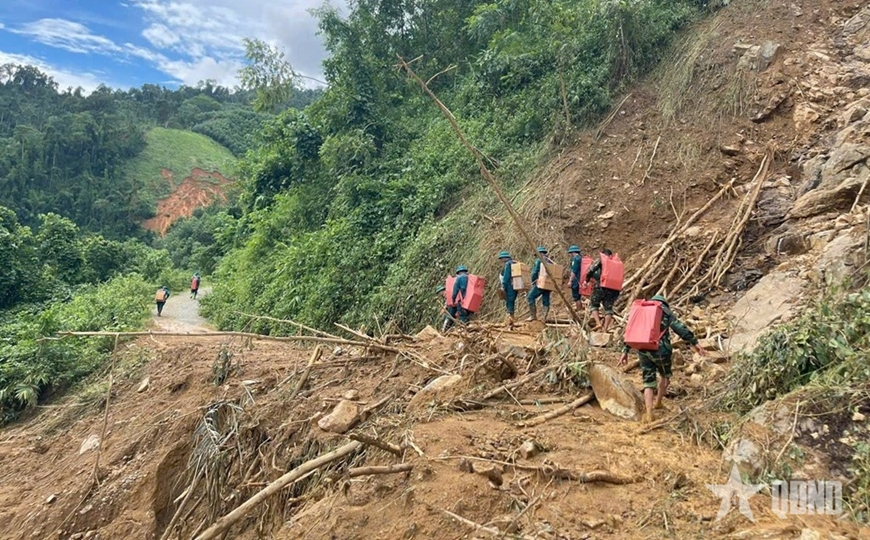 Bộ đội cắt rừng gùi hàng đến với nhân dân vùng cô lập do lũ quét tại xã Yên Nhân. |