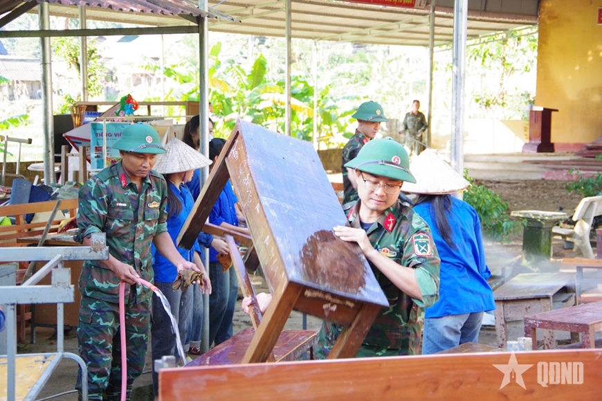Bên cạnh việc giúp đỡ cho các hộ gia đình thuộc đối tượng chính sách và hộ đặc biệt khó khăn, các đơn vị còn ưu tiên khắc phục tại các điểm trường học. Tại Trường Tiểu học Yên Nhân 1 (do lũ quét sau bão số 5) và các trường học ở Vạn Thiện, Minh Thọ xã Nông Cống (sau bão số 10), bộ đội đã làm việc không ngừng nghỉ, cả ngày lẫn đêm, tổ chức dọn rửa, sắp xếp lại bàn ghế, đồ dùng dạy học. Hàng trăm khối đất đá, cây rừng, rác thải đã được giải phóng…