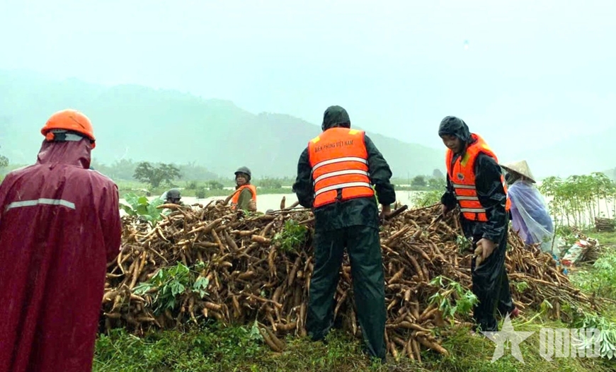 | Hỗ trợ người dân thu hoạch sắn tránh lũ. |