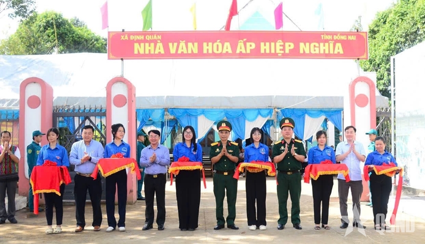 | Các đại biểu cắt băng khánh thành công trình thể dục, thể thao tại Nhà văn hóa Cộng đồng Dân tộc Châu Mạ, ấp Hiệp Nghĩa, xã Định Quán. |