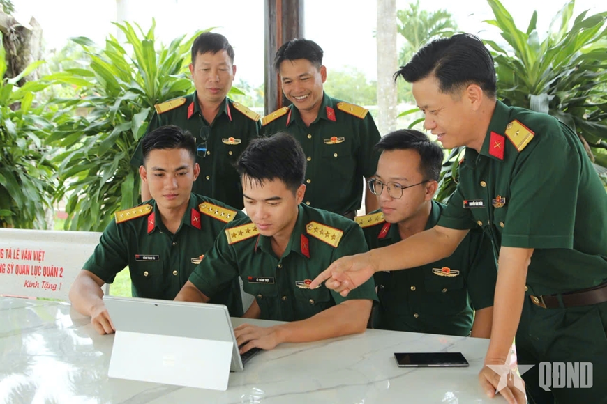 | Thiếu tá Nguyễn Văn Tuấn cùng lực lượng nòng cốt sử dụng công cụ AI tuyên truyền kỷ niệm 60 năm ngày lập Sư đoàn 5. |