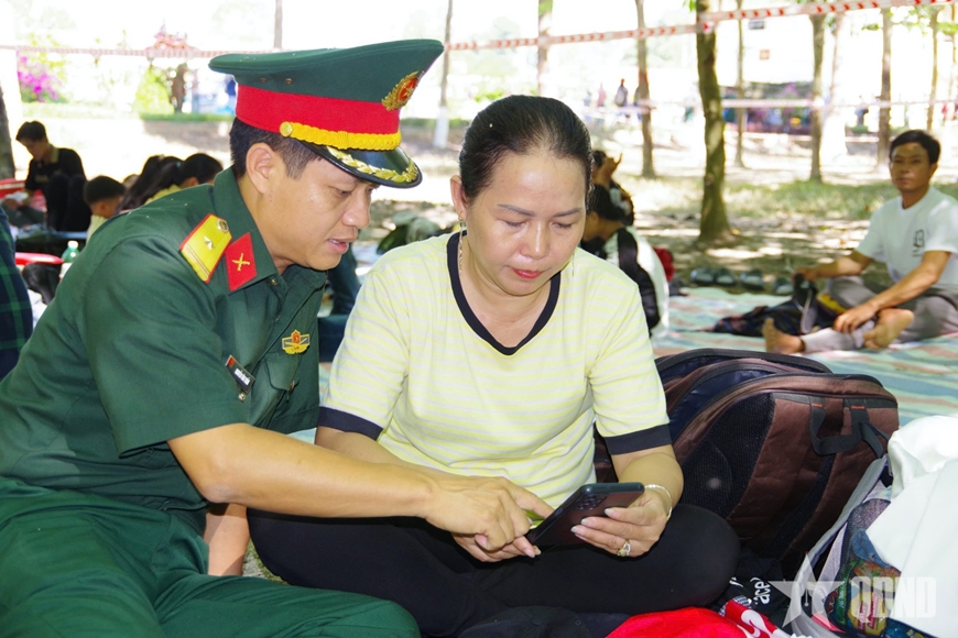 | Thiếu tá Nguyễn Văn Tuấn hướng dẫn thân nhân chiến sĩ sử dụng phần mềm đăng ký thăm trực tuyến. |