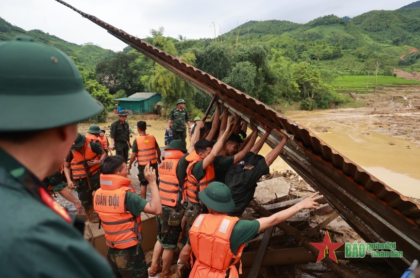 | Bộ đội Sư đoàn 316 tham gia tìm kiếm cứu nạn và giúp nhân dân khắc phục hậu quả bão số 3 tại thôn Làng Nủ (Phúc Khánh, Bảo Yên, Lào Cai). |