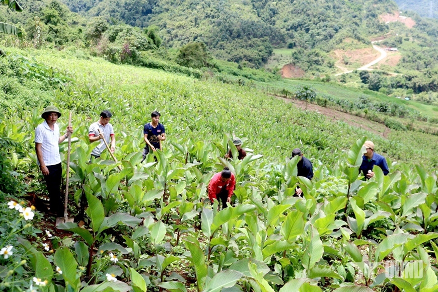 Cán bộ kỹ thuật Tổng công ty Hợp tác kinh tế Quân khu 4 hướng dẫn nhân dân vùng dự án thuộc tỉnh Xiêng Khoảng (Lào) trồng cây dong riềng phát triển kinh tế.