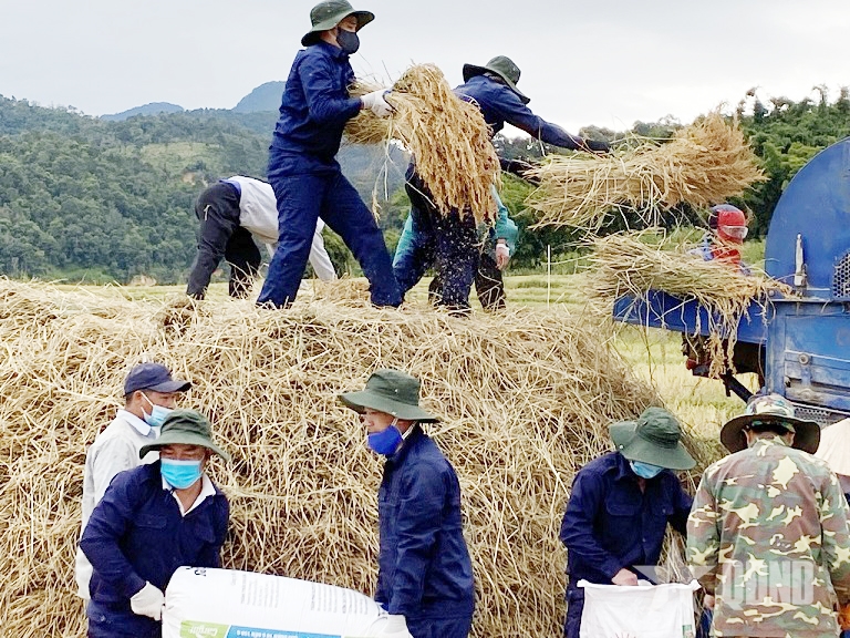 | Đội Quy tập hài cốt liệt sĩ Bộ CHQS tỉnh Nghệ An giúp người dân nước bạn Lào thu hoạch lúa. |