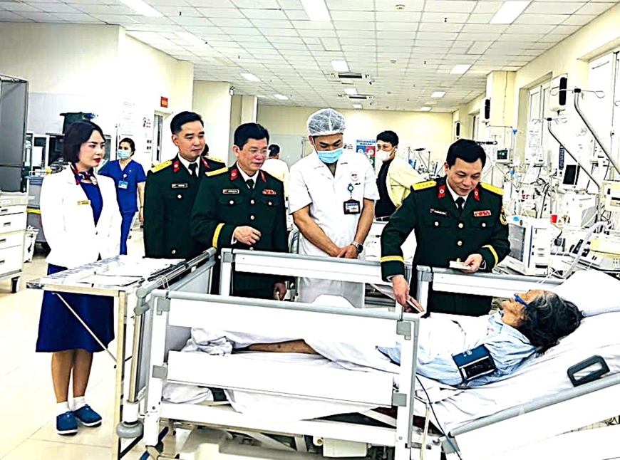 Chỉ huy Bệnh viện Quân y 105 tặng quà, động viên bệnh nhân điều trị tại Khoa Hồi sức cấp cứu dịp Tết Nguyên đán Bính Ngọ 2026. Ảnh: QUÂN DÂN