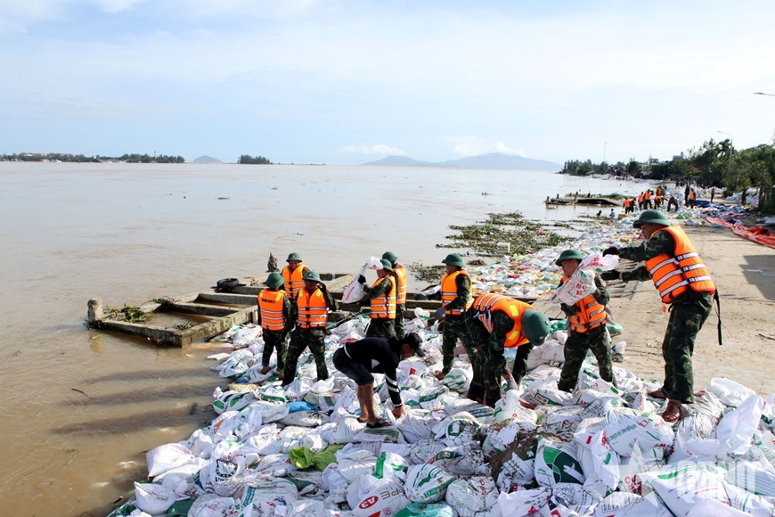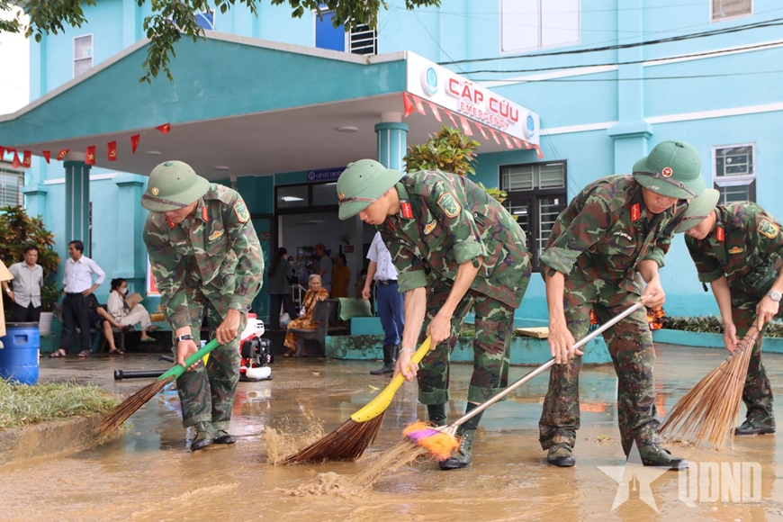 Không nghỉ ngơi sau nhiều ngày dầm mình trong nước lũ để cứu trợ, ngay khi nước rút, hơn 600 cán bộ, chiến sĩ đã nhanh chóng cơ động về các địa bàn bị thiệt hại nặng. Công việc của họ không ồn ào mà đầy khẩn trương: Xếp bao tải cát gia cố kè biển, vận chuyển vật liệu, hỗ trợ người dân dọn vệ sinh, khôi phục sinh hoạt. Mỗi bước chân đi qua đều để lại dấu ấn của tinh thần “vì nhân dân quên mình”.