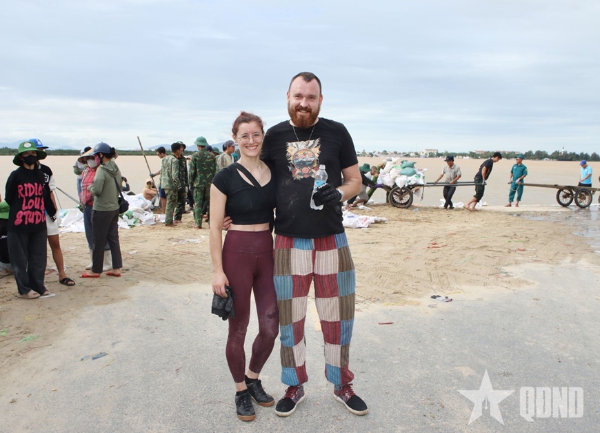 Giữa những chiến sĩ áo xanh là hình ảnh một cặp vợ chồng ngoại quốc tóc vàng, nước da đỏ hoe dưới nắng gió biển miền Trung. Vợ chồng Lika, du khách đến từ Đức đang luôn tay thắt miệng bao cát để người dân và bộ đội chuyển xuống mép bờ kè. Trước đó, họ chỉ vô tình đi ngang qua khi đang du lịch tại Đà Nẵng. Nhưng cảm nhận được sự quyết liệt, tinh thần đoàn kết của tất cả mọi người, họ quyết định dừng lại và góp sức.