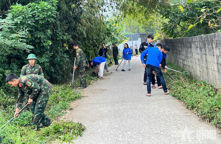 | Cán bộ, chiến sĩ Trung đoàn 209 cùng với đoàn viên thanh niên dọn dẹp vệ sinh đường làng ngõ xóm, phát quang bụi rậm. |