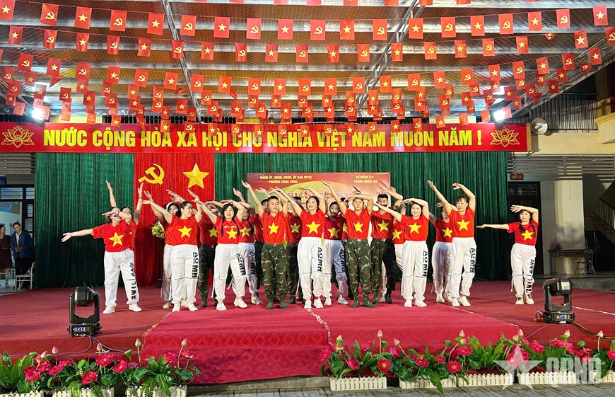 | Cán bộ, chiến sĩ Trung đoàn 209 cùng với bà con nhân dân phường Sông Công trong đêm giao lưu văn hóa, văn nghệ “Thắm tình quân dân”. |