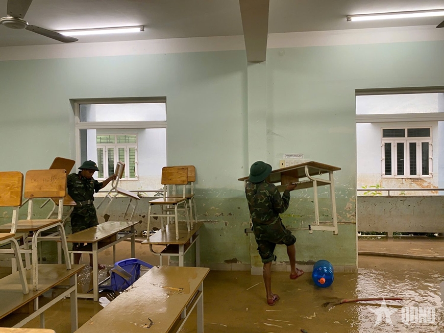 Ngay sau khi mưa lũ rút, Trung đoàn 974 đã kịp thời cơ động lực lượng, tổ chức các tổ công tác bám nắm địa bàn, phối hợp chặt chẽ với cấp ủy, chính quyền địa phương giúp đỡ các trường học.
