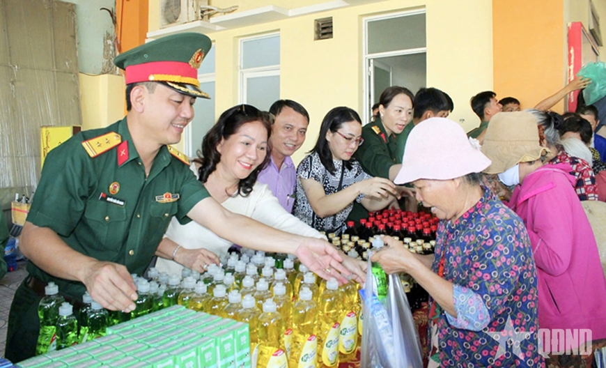 | Cán bộ, nhân viên Trung đoàn Gia Định và cán bộ các đơn vị tặng quà người dân tại chương trình. |