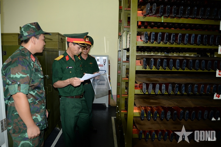 Trung tá Phạm Tuấn Anh (đứng giữa) cùng đồng đội kiểm tra kho kỹ thuật của Sư đoàn 301. |