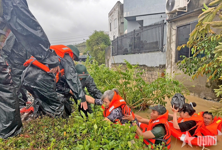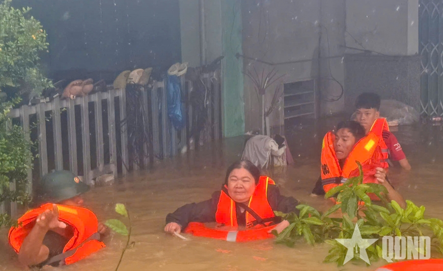 “Khi chúng tôi đến, nhiều nhà dân nước đã ngập sâu, người già, trẻ nhỏ bị mắc kẹt, cô lập, rất nguy hiểm. Trước tình huống đó, cán bộ, chiến sĩ, học viên Trường Quân sự Quân đoàn 34 không quản ngại khó khăn, nguy hiểm, ứng cứu được 11 người bị cô lập và di dời nhiều hộ dân đến nơi an toàn”, Thượng tá Phạm Văn Nam thông tin.