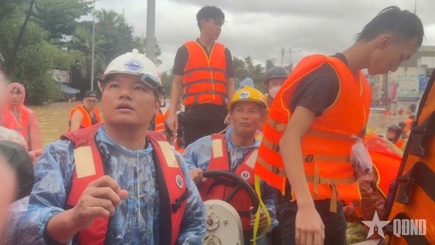 Thượng sĩ Hà Duyên Giang, học viên Nhà trường, thành viên tổ cứu hộ, chia sẻ: “Khi thấy một gia đình có hai cháu nhỏ đứng trên mái hiên chờ cứu, chúng tôi lập tức áp xuồng vào. Khi ra đến nơi an toàn, người mẹ ôm chặt lấy tay tôi mà khóc. Những khoảnh khắc như vậy khiến chúng tôi càng thêm tự hào khi tham gia cứu hộ người dân”.