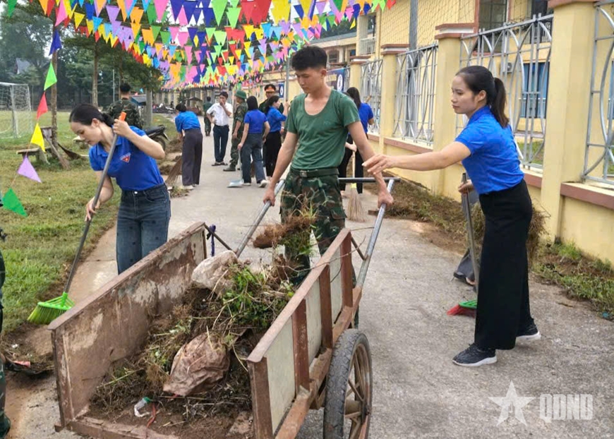 Cán bộ, học viên Tiểu đoàn 1 và cán bộ, nhân dân xã Đoài Phương tham gia tổng vệ sinh trên địa bàn.