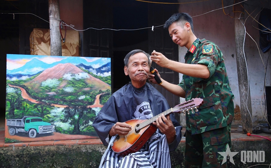 Học viên Tiểu đoàn 1 cắt tóc phục vụ nhân dân địa phương.
