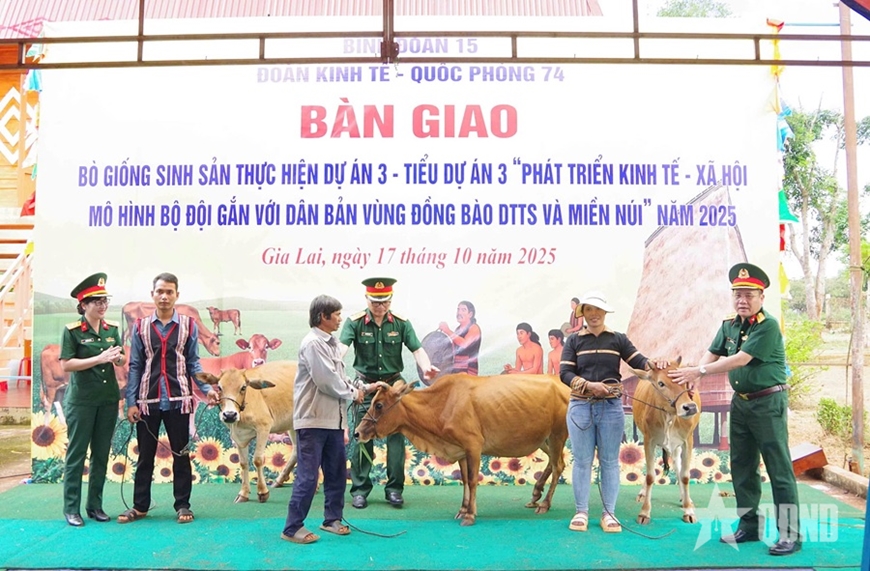 | Đoàn Kinh tế - Quốc phòng 74 trao bò giống tặng người dân. Ảnh: TÂM QUÂN |