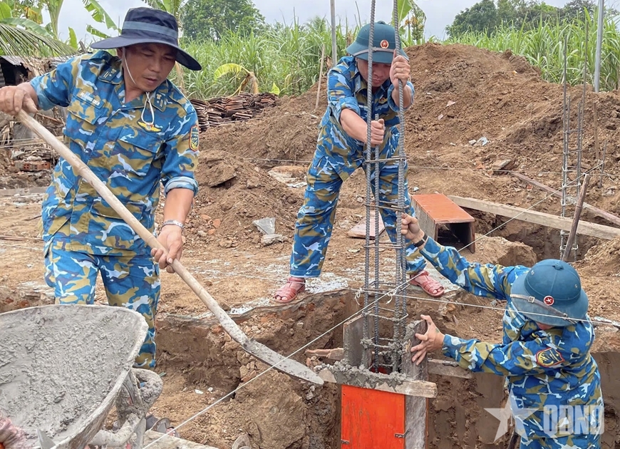| Bộ đội Sư đoàn Phòng không 375 trộn bê tông, đổ móng nhà giúp bà con nhân dân. |