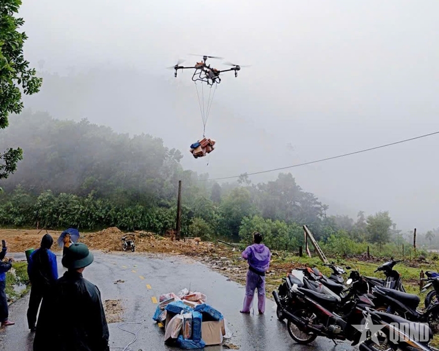 Do địa hình chia cắt, sạt lở nghiêm trọng, nhiều điểm không thể tiếp cận bằng phương tiện cơ giới, các đơn vị đã linh hoạt sử dụng flycam vận chuyển hàng cứu trợ đến từng cụm dân cư bị cô lập, bảo đảm an toàn tuyệt đối cho người và phương tiện.