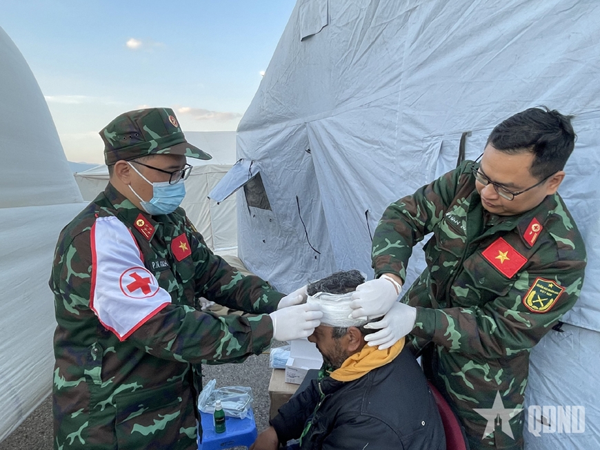 | Quân y thuộc đoàn cứu hộ, cứu nạn Quân đội nhân dân Việt Nam băng bó vết thương cho nạn nhân trong thảm họa động đất ở Thổ Nhĩ Kỳ, tháng 2-2023. Ảnh: PHẠM HIẾU |