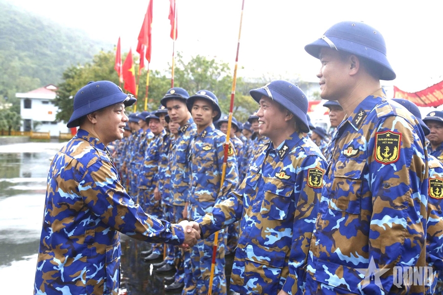 Chuẩn đô đốc Nguyễn Đăng Tiến, Bí thư Đảng ủy, Chính ủy Vùng 3 Hải quân động viên bộ đội trước khi lên đường.