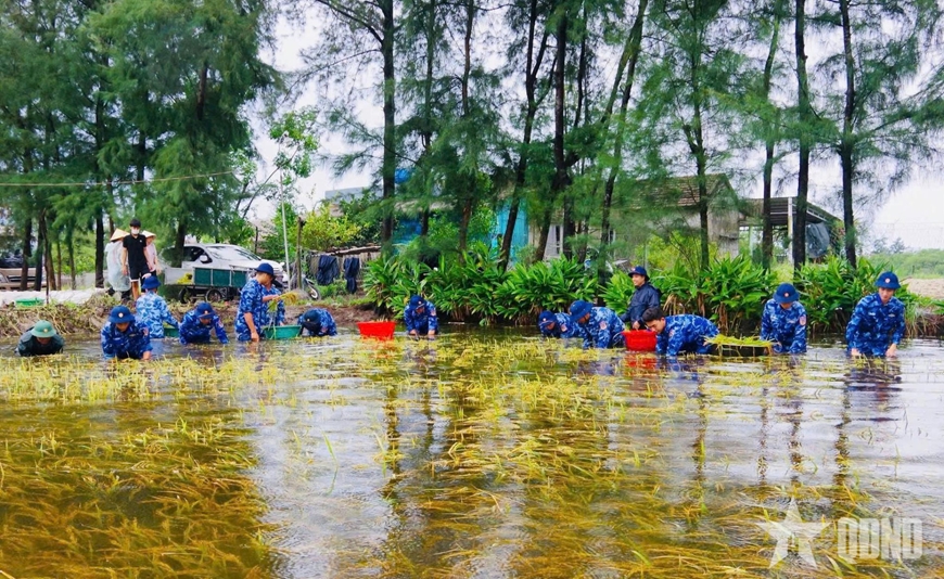 Cán bộ, chiến sĩ Hải đội 202 (Vùng Cảnh sát biển 2) giúp nhân dân thu hoạch lúa bị ngập lụt do mưa lũ gây ra tại Quảng Trị.