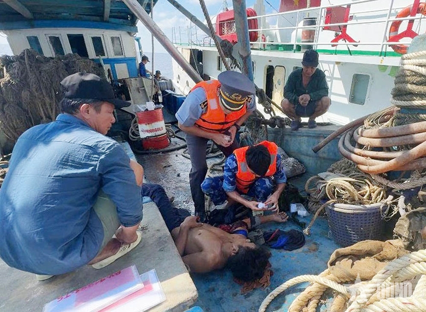 | Quân y Vùng Cảnh sát biển 3 hỗ trợ sơ cứu ngư dân bị nạn trên biển. |