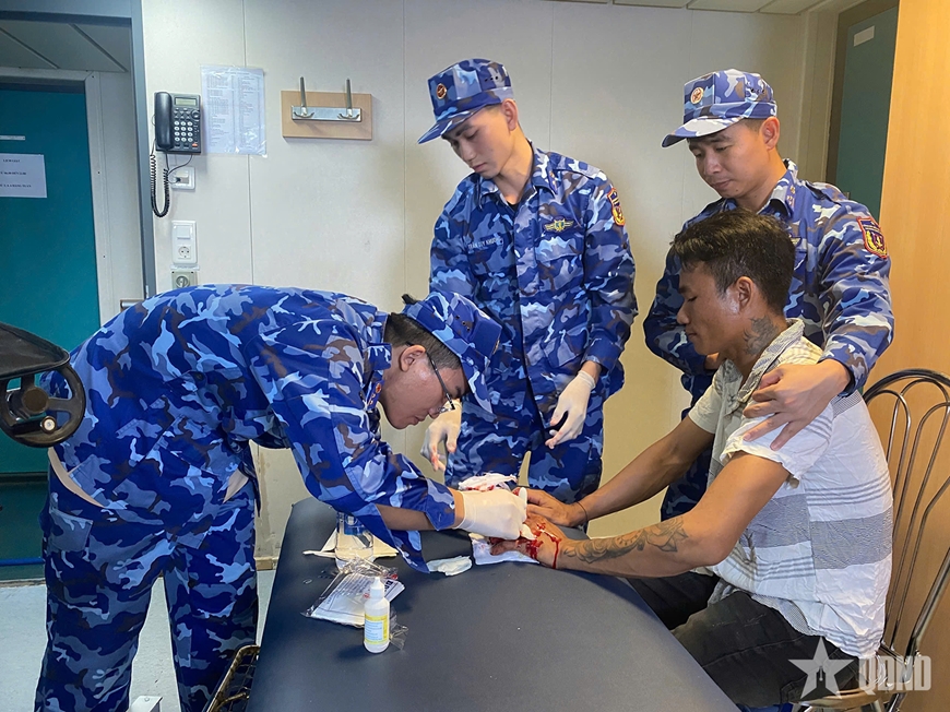 Cán bộ, chiến sĩ Tàu CSB 8005, Hải đoàn 42, Bộ tư lệnh Vùng Cảnh sát biển 4 tiến hành sơ cứu, hỗ trợ y tế cho ngư dân Vi Văn Thoải.