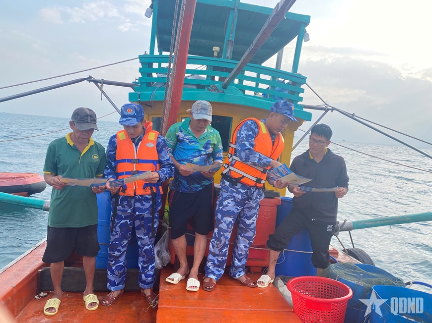 | Cán bộ, chiến sĩ Tàu CSB 3002 tuyên truyền pháp luật cho ngư dân. |