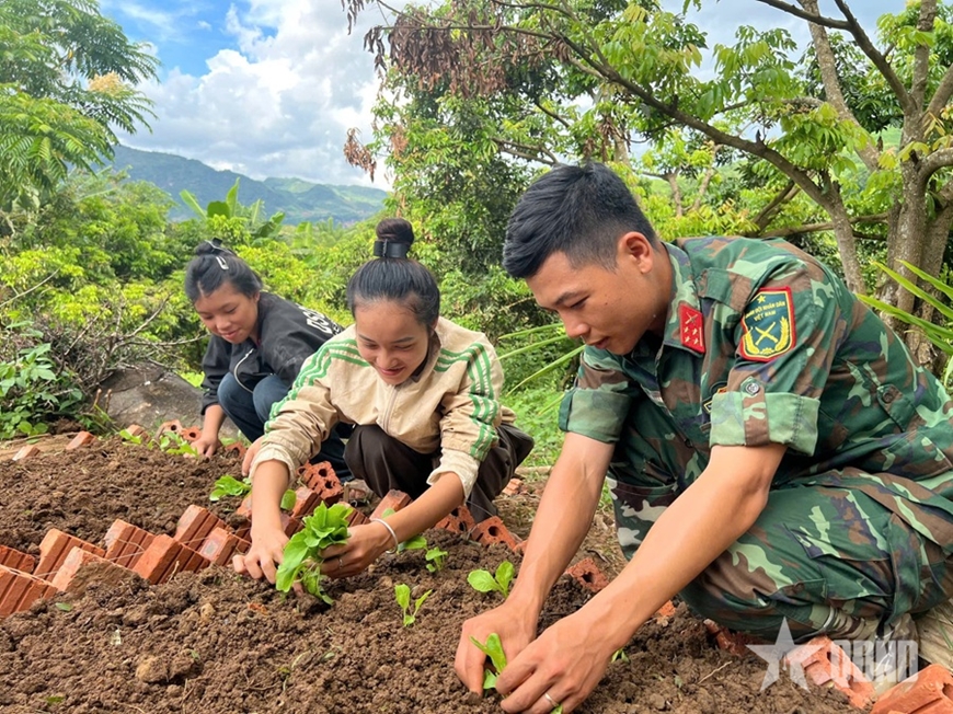 Bộ đội Sư đoàn 316 giúp gia đình chị Lèo Thị Hiến ở bản Đứa Cát, xã Chiềng Sơ khôi phục vườn rau sau mưa lũ. |