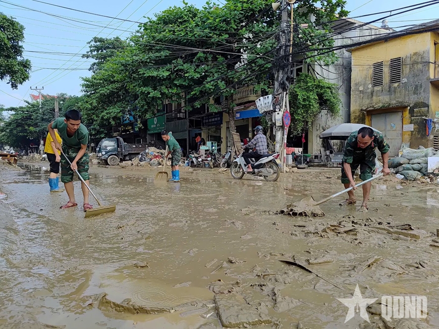 Bộ đội Trung đoàn 209 dọn bùn trên đường Bến Oánh, phường Phan Đình Phùng, tỉnh Thái Nguyên. |