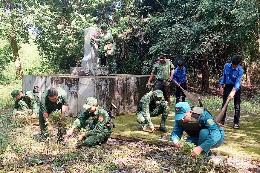| Dọn vệ sinh xung quanh cột mốc. |