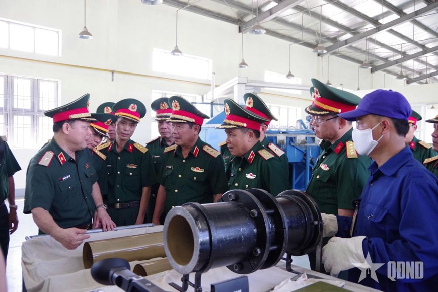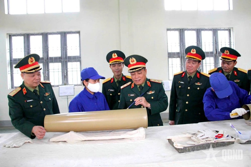 Thượng tướng Lê Huy Vịnh, Ủy viên Trung ương Đảng, Thứ trưởng Bộ Quốc phòng kiểm tra công tác sửa chữa vỏ liều đạn 152mm tại Xưởng X265.