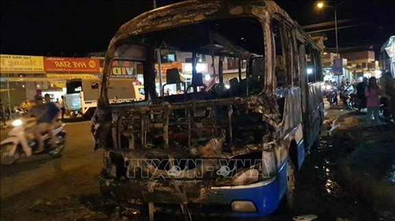 Tối 25-11, tại vòng xoay trung tâm hành chính huyện Phú Riềng (đoạn qua xã Phú Riềng trên đường ĐT 741 ở huyện Phú Riềng, tỉnh Bình Phước), chiếc xe khách 24 chỗ dừng mua hàng bất ngờ bốc cháy dữ dội.