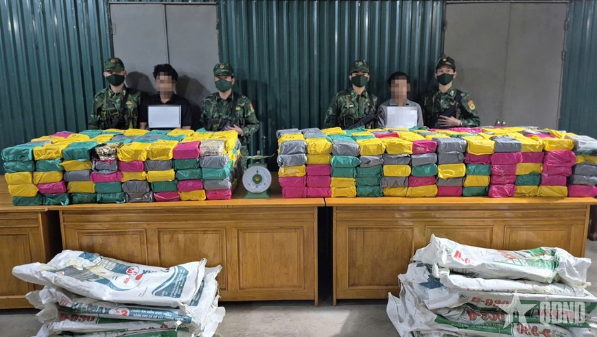Trước đó, lúc 16 giờ cùng ngày, tại xã Dân Hóa (tỉnh Quảng Trị), Phòng Nghiệp vụ BĐBP tỉnh Quảng Trị chủ trì phối hợp với Đồn Biên phòng cửa khẩu quốc tế Cha Lo phát hiện, bắt giữ 2 đối tượng người Lào cùng tang vật 500kg ma túy, chủ yếu là methamphetamine.