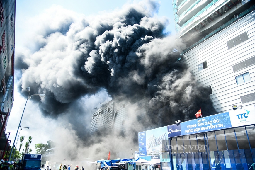 Tại hiện trường, khu vực tầng 1 của Dự án trung tâm cao ốc phức hợp Nguyễn Kim bất ngờ có khói đen bốc lên nghi ngút, ám đen một mảng lớn ở mặt ngoài của các tầng phía trên.