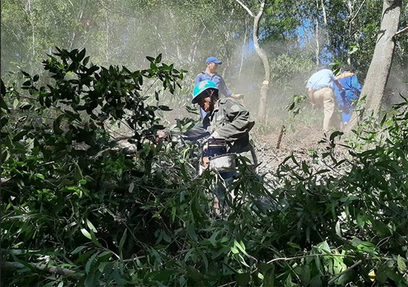 Phát quang đường băng cản lửa quanh khu vực xăng dầu. Ảnh: Doãn Hòa