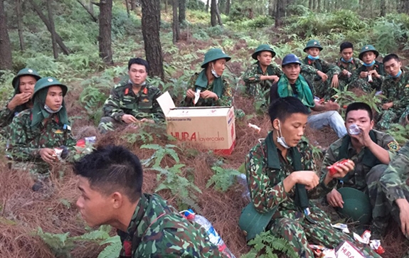 Cán bộ, chiến sĩ nghỉ giải lao ăn trưa giữa rừng. Ảnh: Thanh Tú