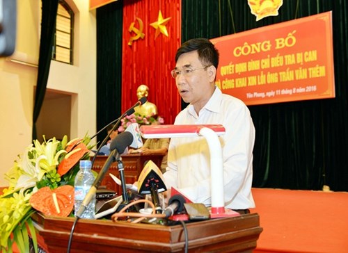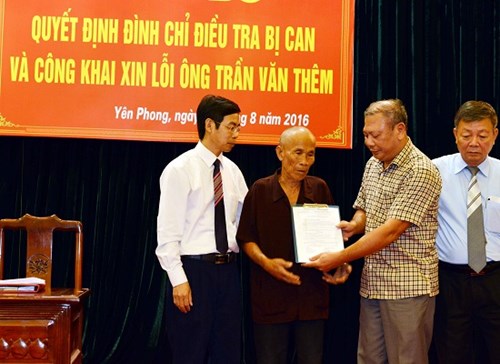 Buổi công bố quyết định đình chỉ điều tra bị can và công khai xin lỗi đối với ông Trần Văn Thêm (trú tại thôn Đức Lân, xã Yên Phụ, huyện Yên Phong, tỉnh Bắc Ninh) có sự tham dự của đồng chí Bùi Ngọc Hòa, Phó chánh án Thường trực TAND tối cao; Trung tướng Trần Trọng Lượng, Phó tổng cục trưởng Tổng cục Xây dựng lực lượng Bộ Công an; lãnh đạo Viện Kiểm sát nhân dân tối cao; TAND cấp cao tại Hà Nội, Viện Kiểm sát nhân dân cấp cao tại Hà Nội, các đơn vị chức năng của liên ngành các cơ quan Tư pháp Trung ương; đại diện Tỉnh ủy, UBND, Mặt trận Tổ quốc tỉnh Bắc Ninh cùng các cơ quan của huyện Yên Phong và xã Yên Phụ; sự tham dự trực tiếp của ông Trần Văn Thêm cùng đại diện gia đình và nhân dân địa phương.