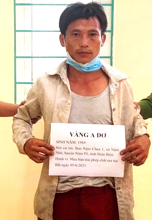 Trước đó, vào hồi 10 giờ ngày 5-6, tại khu vực bản Nậm Chua 1, xã Nậm Nhừ (Nậm Pồ, Điện Biên), Công an huyện Nậm Pồ phối hợp Đồn Biên phòng Nậm Nhừ (BĐBP tỉnh Điện Biên) bắt quả tang 1 đối tượng về hành vi mua bán trái phép chất ma túy. Tại cơ quan điều tra, đối tượng khai là Vàng A Dơ, sinh năm 1989, trú tại bản Nậm Chua 1, xã Nậm Nhừ (Nậm Pồ, Điện Biên).
