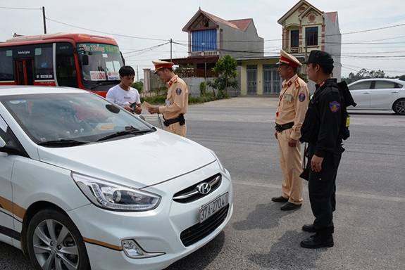 Cán bộ, chiến sĩ Trạm CSGT Quảng Xương, Phòng CSGT Công an tỉnh Thanh Hóa thực hiện nhiệm vụ kiểm soát phương tiện. |