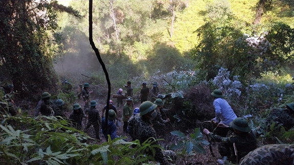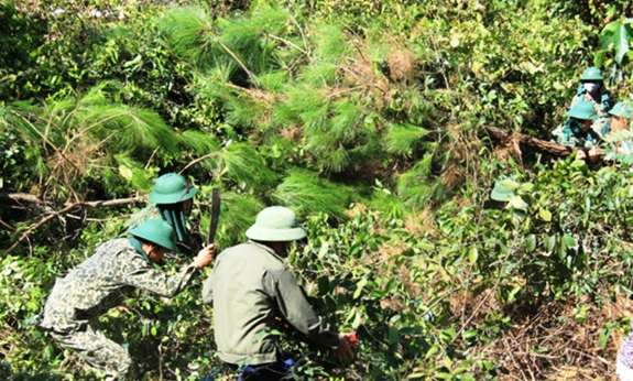 Cán bộ, chiến sĩ LLVT Quân khu 4 phát quang bụi rậm, mở rộng đường băng cản lửa ngăn chặn không cho đám cháy lây lan