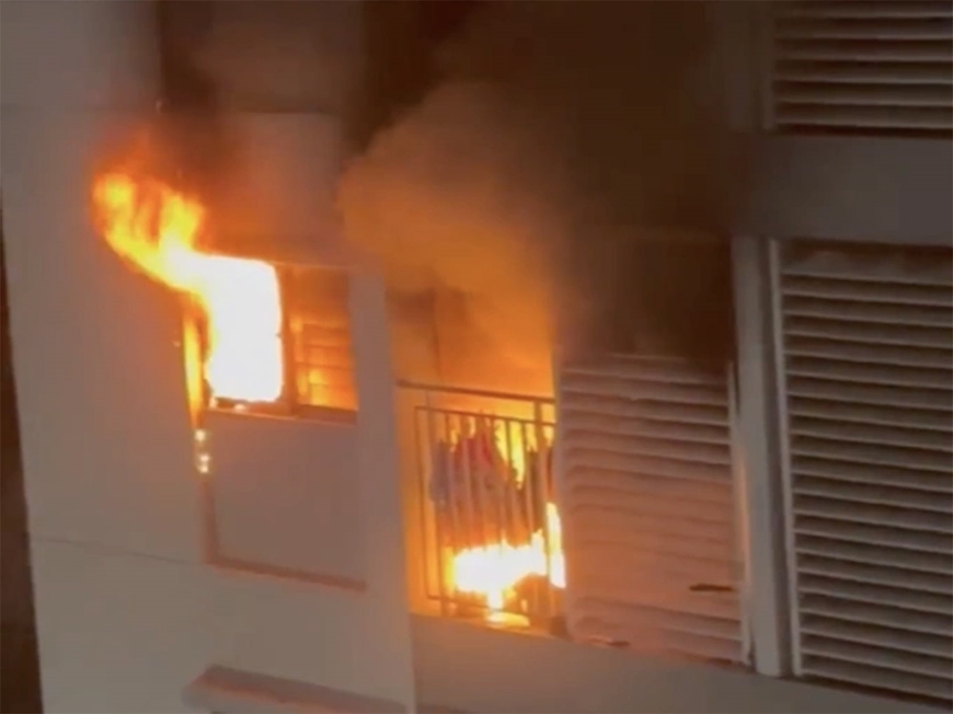 Đám cháy xuất phát từ khu vực phòng khách, gần cửa ra vào, nhanh chóng lan vào đồ nội thất, tạo khói dày khiến ba mẹ con mắc kẹt trong căn hộ.