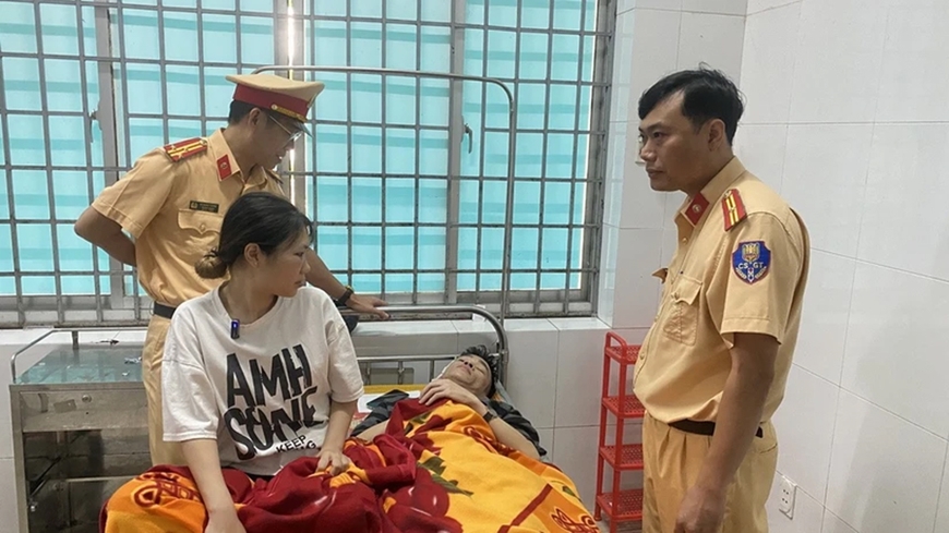 | Lãnh đạo Cảnh sát giao thông Công an tỉnh Phú Yên thăm hỏi nạn nhân đang điều trị tại Trung tâm Y tế thị xã Sông Cầu. Ảnh: TTXVN |